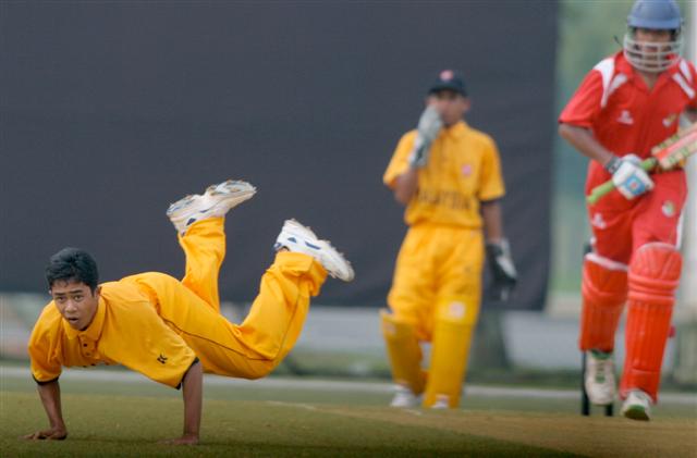 NASIRUDDIN MAZLAN gagal menahan asakan pemukul Singapura pada pertemuan dengan Singapura di Bayuemas Oval 1 April 2009.